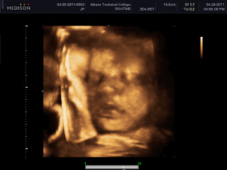 A few weeks ago a friend of mine posted on facebook that the sonography department at Athens Tech needed volunteers for 3D ultrasounds. I have always wanted to do a 3D ultrasound, so I jumped at the chance. Sam and I were absolutely amazed at what we were able to see. Annabelle currently weighs 4lbs 5 oz. She is on track to be somewhere between 7 and 8 pounds. Yay! It looks like Tyler will be the big baby of the family.